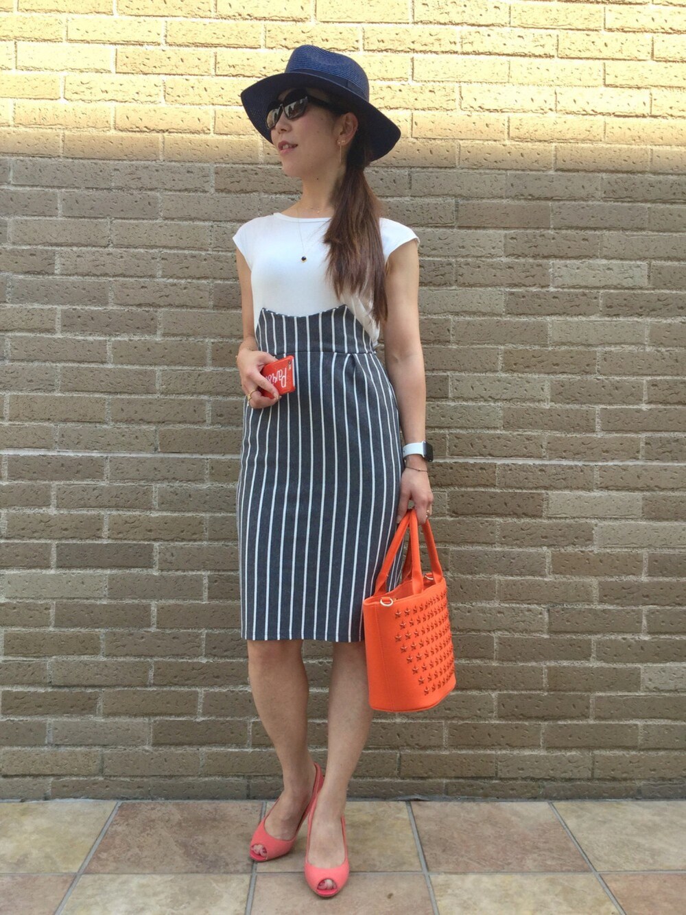 眩しい日のワンピースコーデ☆ 日差しが凄かったので、頭だけ光ってます^^; 白Tとハイウエストスカートを組み合わせたような ワンピース。 ストライプ効果で脚長効果(笑) シンプルな装いなので、靴とバッグとiphoneケースをアクセントに☆ ジュエリーはネックレスの重ね付けです☆ マットなムーンネックレス(ピナコテーカ)と 六角形 ダイヤモンド ネックレス(ピナコテーカ) ジュエリーのアップは小窓でご覧ください~♪