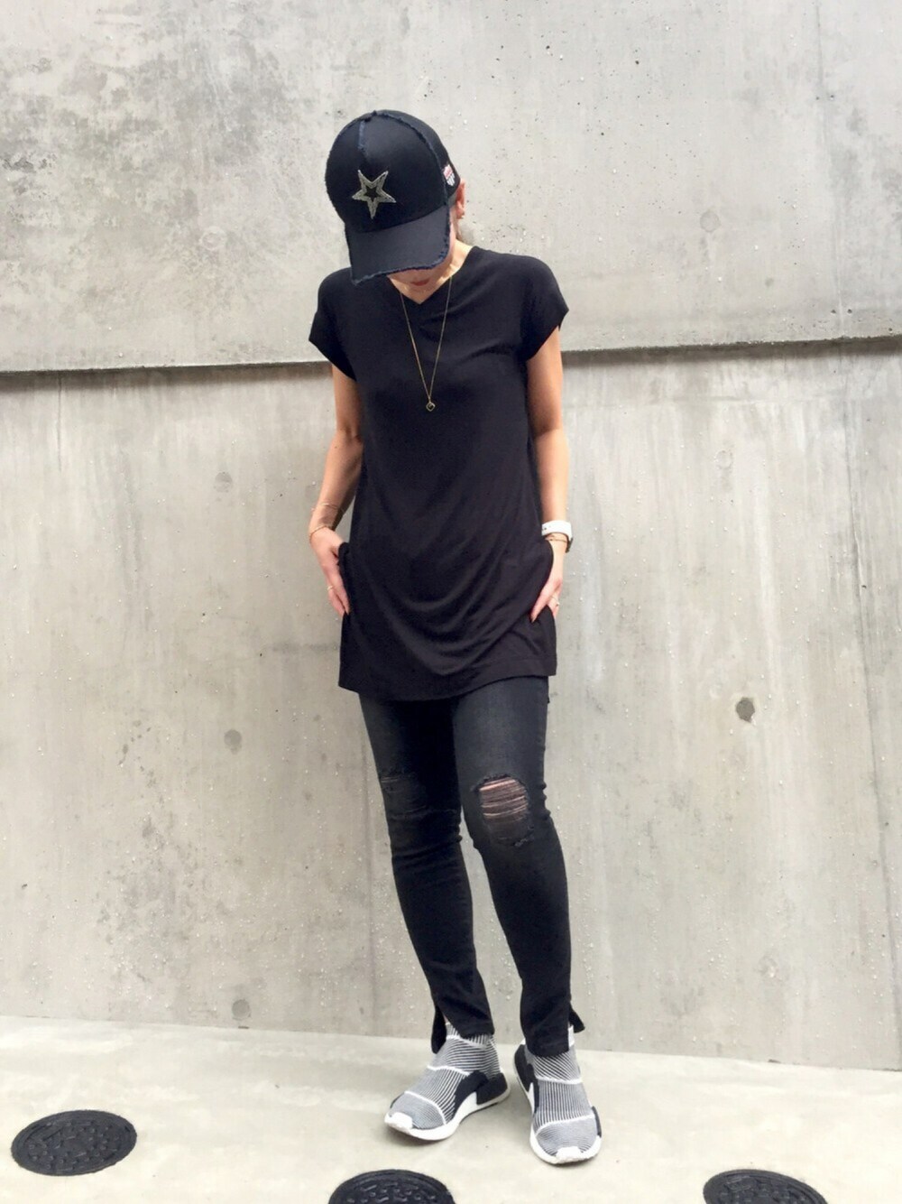 ブラックコーデ😎 ZARAのダメージデニム👖 裾にスリット入り 膝にダメージ入っているので履くとき要注意なタイプです😅 脚伸ばすとダメージ見えなくなるのね~😆 別📸小窓で💡 最近ZARAがお気に入りです😊🙌 ジュエリーはネックレスの重ね付けです✨ 大きめクロスダイヤモンドネックレス(ピナコテーカ)と 3本爪のシンプル一粒ダイヤモンドネックレス(ピナコテーカ) ジュエリーのアップは小窓でご覧ください~✨ 今日もご覧頂きありがとうございます❤️ いいね、セーブ、コメント、フォローまでとっても嬉しいです💕 初めましての方もよろしくお願いします✨