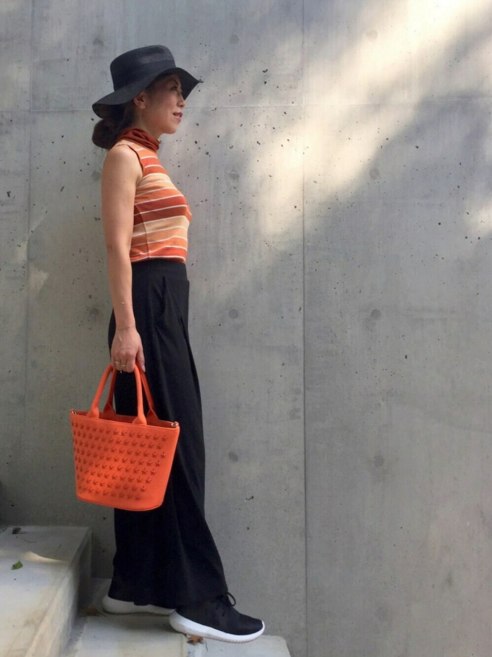 ノースリボーダーでちょっと秋色コーデ✨ 台風近づいてきてますね☔️ 東京も雨が強くなってきました。 お出かけの際は気を付けて下さい〜🌂 テラコッタ風のオレンジボーダーノースリタートル😊 処分しようかと思いつつ、案外今気分じゃない?と敗者復活的なニット💡 シンプルにブラックワイドパンツ 今回はイン😆🙌 アディダス チュブラー スニーカーは 黒ベースにソールのみ白 やっぱりスニーカーはこの配色バランスが一番合わせやすいと思っております😋💕 ノースリニットに合わせて バッグもオレンジ~🍊 ジュエリーはブレスレットの重ね付けです✨ ラメみたいにキラキラと輝くシンプル ハートブレスレット(ピナコテーカ)と 4本爪のシンプル一粒ダイヤモンドブレスレット(ピナコテーカ) ジュエリーのアップは小窓でご覧ください〜😆 今日もご覧頂きありがとうございます✨ いいね、セーブ、コメント、フォローまでとっても嬉しいです💕 初めましての方もよろしくお願いします❤️