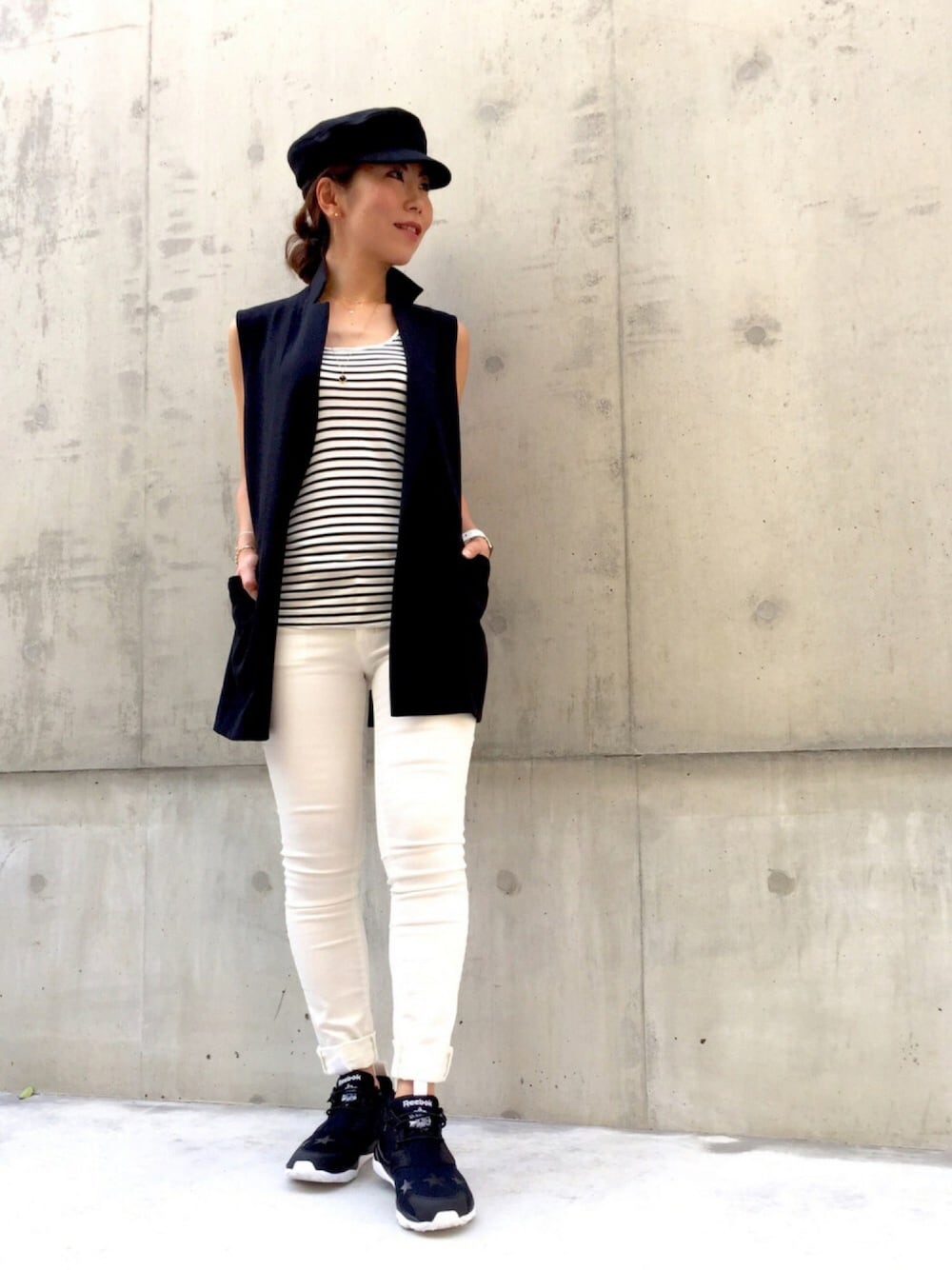 マリンなジレコーデ✨ 夏な感じのボーダータンクにジレ💡 ちょうど今時期ノースリもまだ着られるし でも夏っぽさはもう、、、みたいな時にちょうど良い感じです😊 ボタンも付いていないので ベルトなどを合わせても良いかも😆👍 スニーカーはリーボックポンプフューリーライト アッパーのところに星が3つ⭐️⭐️⭐️ stayrealとのコラボ 黒に白ソールスニーカーがやっぱり合わせやすい気がします😎👌 マリンキャップも大活躍😆 ジュエリーはネックレスの重ね付け✨ シンプル人気の6本爪一粒ダイヤモンド ネックレス(レデッサンドゥデュー)と 柔らかな輝きが魅力のフルムーンネックレス(ピナコテーカ) ジュエリーのアップは小窓でご覧下さい〜✨ 今日もご覧頂きありがとうございます✨ いいね、セーブ、コメント、フォローまでとっても嬉しいです💕 初めましての方もよろしくお願いします❤️