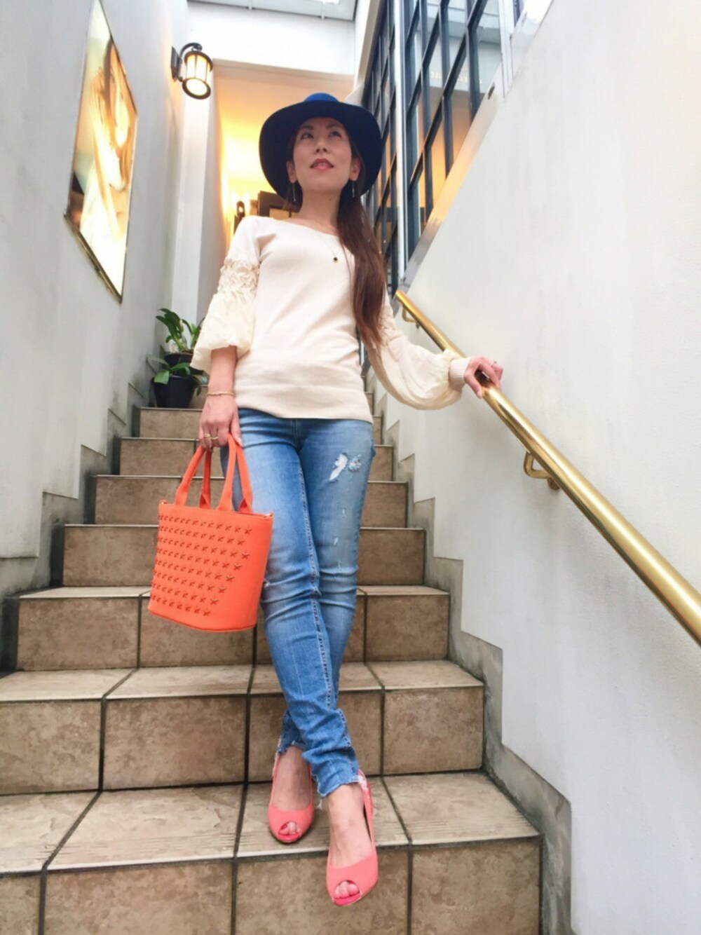 おはようございます 今日もご覧頂きありがとうございます✨ シンプル大人カジュアルに⭐️ ダメージデニムに フレッスリーブのニット ニットは袖の部分がブラウスになっていて 腕の部分のデザインがとっても気に入ってます😊 ベージュでも、黄色味がかった色が好きなので そこも好きな点💡 アクセントにオレンジのスター スタッズバッグ なんだか春っぽい? 一応フェルトハットを被って秋らしく、なのです・・・ ジュエリーはピアスを✨ ルースのキュービックジルコニアが揺れるシンプル アメリカンピアス(ピナコテーカ)と オープンハート スタッドピアス(ピナコテーカ) ジュエリーのアップは小窓でご覧ください✨ いいね、セーブ、コメント、フォローまでとっても嬉しいです💕 初めましての方もよろしくお願いします❤️