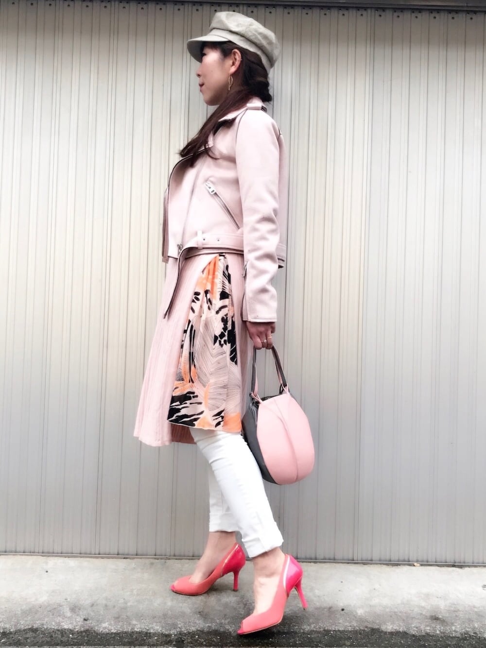 おはようございます ご覧頂きありがとうございます✨ ピンクライダースでピンクコーデ 毎朝着るものに悩む今日この頃 とりあえず何か一つ決めて、そこから合わせるものをチョイスな日々です ピンクのGUワンピが目に付いた日 この前柄ワンピを着たので、その残像があったのかな? 柄スカート重ねました 春らしく、白パンツにパンプス ピンクならピンクでまとめるのも結構好きです🌷 ジュエリーはピアスを✨ シンプルチェーン アメリカンピアスと 定番6本爪の一粒ダイヤモンドピアスです ジュエリーのアップは小窓でご覧ください✨ いいね、セーブ、コメント、フォローまでとっても嬉しいです💕 初めましての方もよろしくお願いします❤️