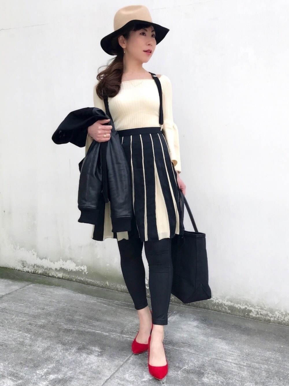 おはようございます ご覧頂きありがとうございます✨ ベージュ×ブラックなモノトーン インスタでhononちゃんから受け取ったストライプコーデバトンです😋 ストライプみたいなプリーツスカートの色に合わせてフレアスリーブニット+サスペンダー レギンス足しつつ赤パンプスに頼る👠(笑) 手に持っているのはライダースです どうかな?🙈💕 ジュエリーは50センチのバーネックレスと、ラインダイヤモンドネックレスの重ね付けです✨ いいね、セーブ、コメント、フォローまでとっても嬉しいです💕 初めましての方もよろしくお願いします❤️