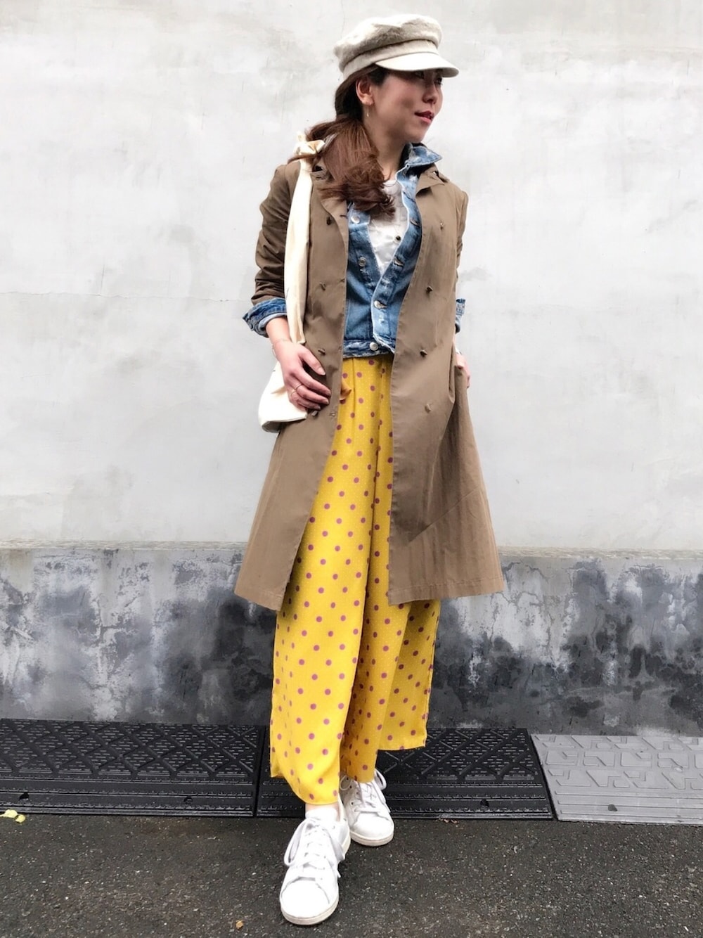 おはようございます ご覧頂きありがとうございます✨ 今月もよろしくお願いします また急に寒くなったので、デニムジャケット+トレンチコートでアウターOnアウター 派手なドットワイドパンツのイエローが差し色です ジュエリーは一粒ダイヤモンドフックバングルとクロスブレスレットの重ね付けです⭐︎ いいね、セーブ、コメント、フォローまでとっても嬉しいです💕 初めましての方もよろしくお願いします❤️