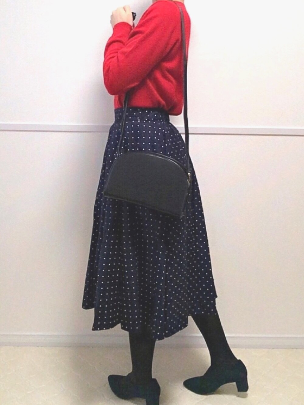 バレンタインも近いので デートコーデアップします♡ レッドニットを引き立てるには 他のアイテムを暗い色で まとめるのが簡単。 私は骨格診断※がウェーブのため クルーネックを選びがちですが 深いVネックが似合う人は ぜひ着て、色気アップを 狙ってほしいです。 ☆point 1.レッドを引き立てるコーデ →他の色を暗い色でまとめる。 →モノトーンやネイビーなど。 2.Xラインシルエット →ウエストをマークする。 →メリハリができて細見えに◎ 3.シーンに合わせたコーデ →きちっとしたレストランに行くとき。 →キレイめにまとめて特別感をアップ。 ※骨格診断とは。 →似合う服のデザインと素材がわかる。 →UNIQLOアプリなどで診断可能。 →ただし診断結果に囚われすぎない。 →服を楽しむのが大切。 ☆item ・カシミアニット(キレイめ) → L size ・ドットスカート(キレイめ) → M size ・パンプス(キレイめ) ・ハーフムーンバッグ 見てくださってありがとうございます! フォロー・いいね、 とてもうれしいです!