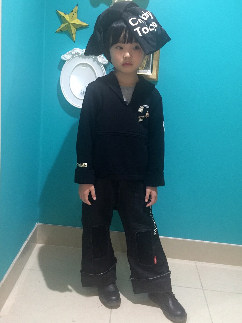 新生chubbygang ファイバーダウンロゴマフラーをビックヘアバンド風に セーラープルオーバーにイチオシ ピンバッジを✨ ブラックコーデ