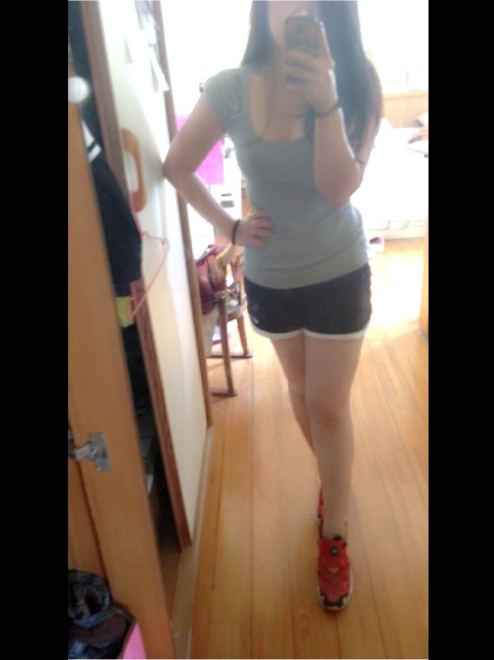レッド系のスニーカー、ブラック系のその他パンツを着用したレディースの夏コーディネートの1枚目の写真