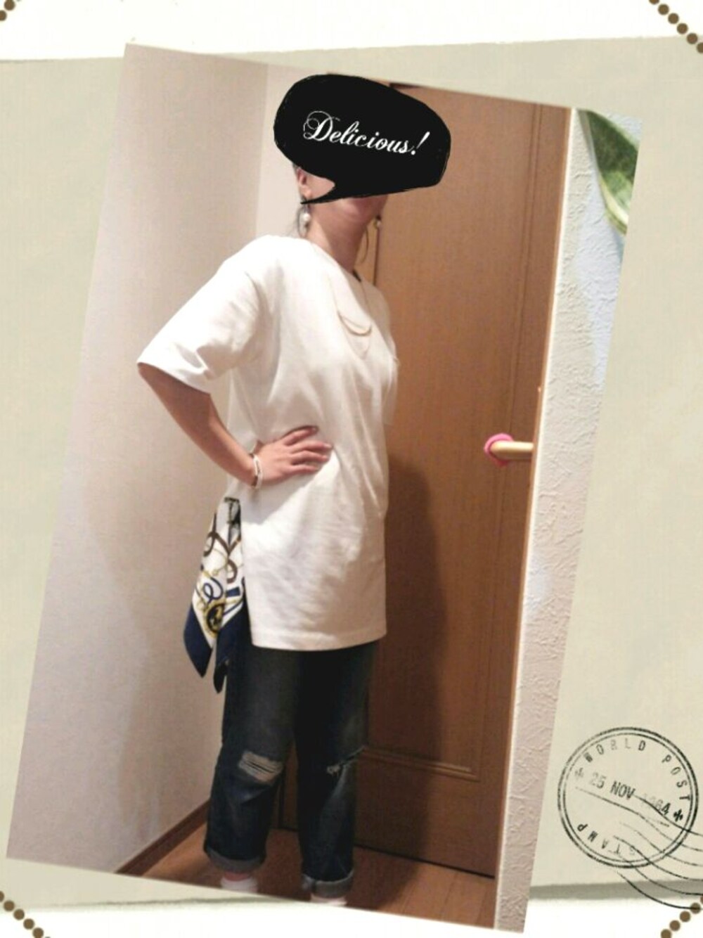 全身GUです!白のロングTにガールフレンドアンクルジーンズを合わせてシンプルにしてみました(^_^) 夏コーディネートのブルー×白で統一したくて、スカーフをポイントに!腰のベルトバンドに縛りました(^_^)