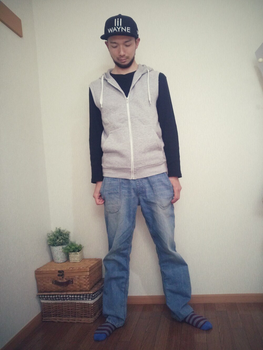 主人のコーデです。着替えたけど結局お出掛けしなかった(´・c_・`)笑、 ベスト…H&M、トップス…DBL、デニム…LOKY、キャップ…NEWERA