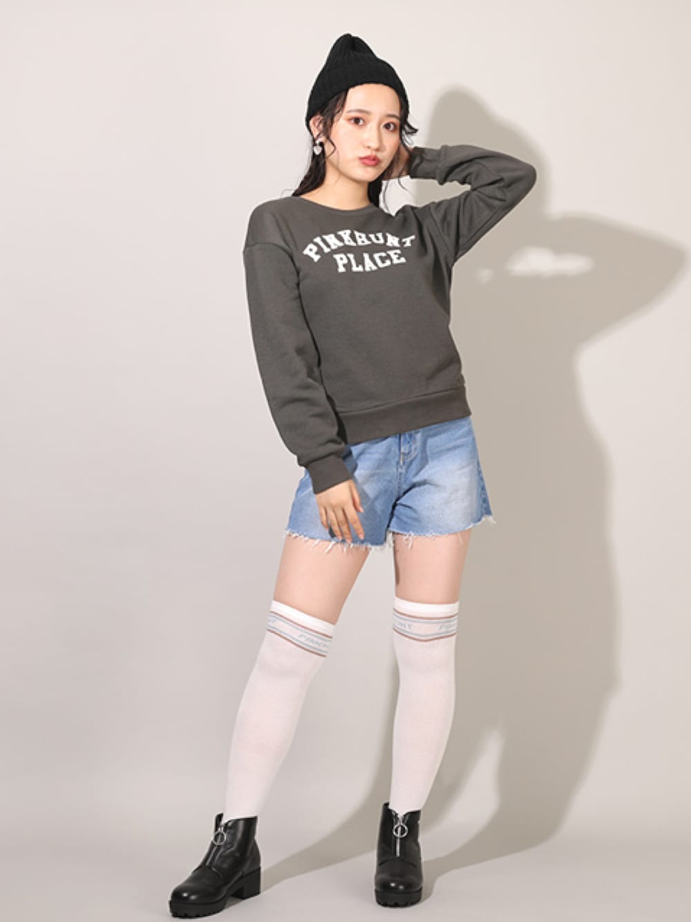 シンプルなカレッジロゴトレーナーと ショーパンでカジュアルコーデ◎ ニーハイとブーツでおしゃれ度UP!