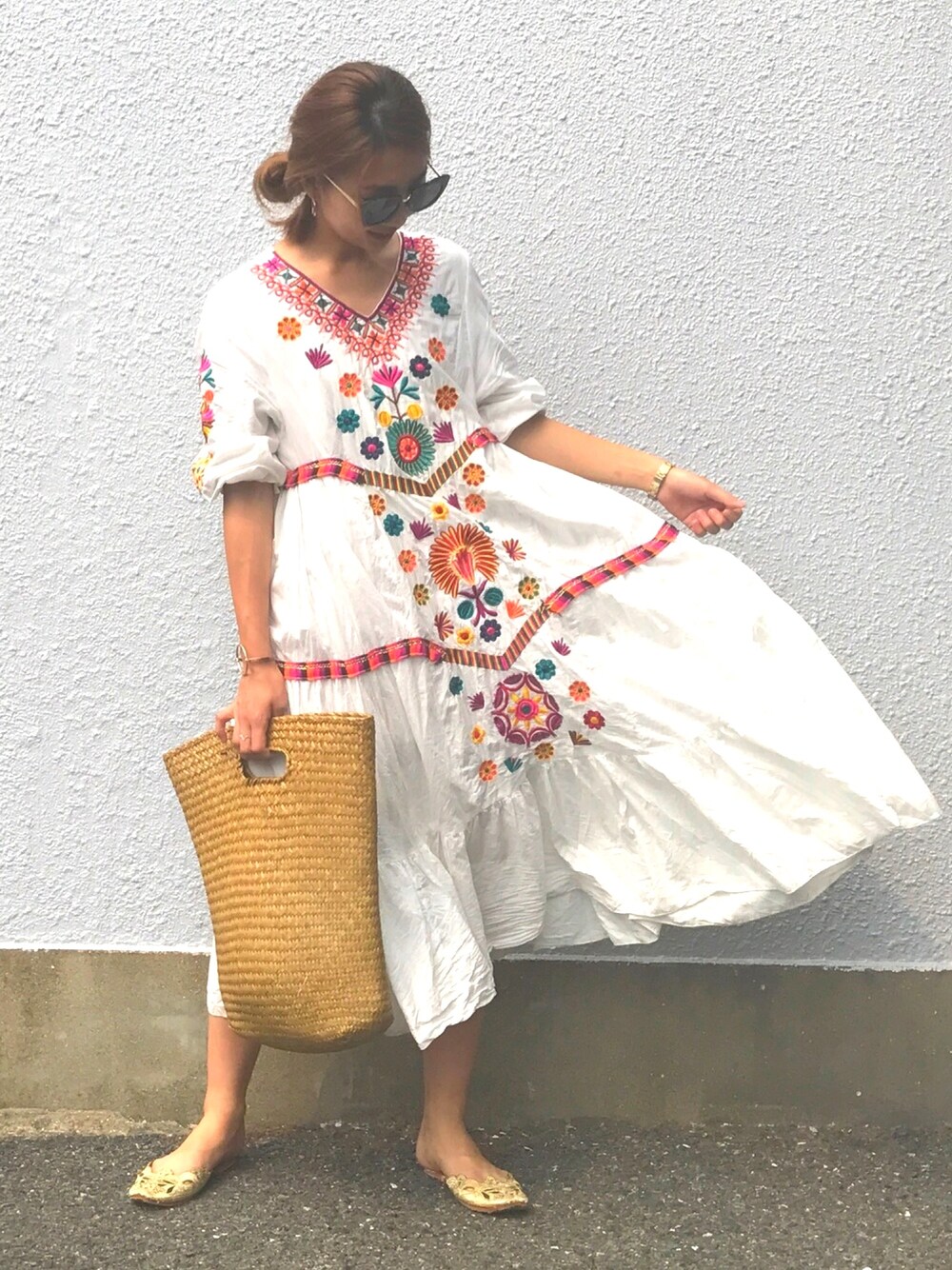 買ってから週1は着てる刺繍ワンピは、着てるだけでハッピーになる🌈🌈🌈薄手だからまだまだ活躍しそう🌼🌼🌼 バブーシュはドバイで買ったお気に入りのやつ🌵🌵 カゴバッグは韓国の市場で購入💞💞