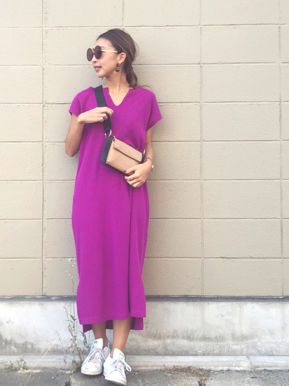 このパキッとした色に一目惚れしたワンピース💋💋サコッシュとスタンスミスでスポーティにスタイリング👌🏾🌈