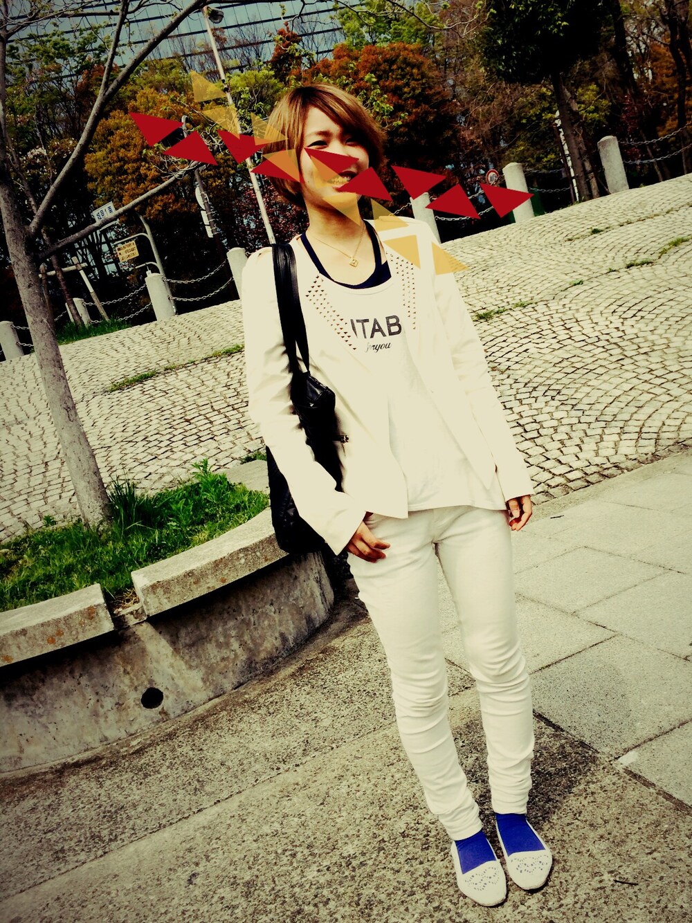 ホワイト系のその他シューズ、ブルー系のソックス/靴下を着用したレディースの春コーディネートの1枚目の写真