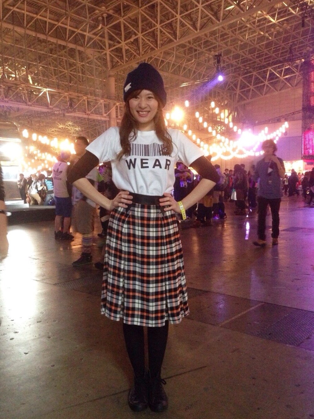 撮られ慣れない引きつり顔(´-ω-`) WEAR Tの背中はFUCKシールです。 ひざ下スカートで動きやすく。 CONVERSEはハイカット一択です。