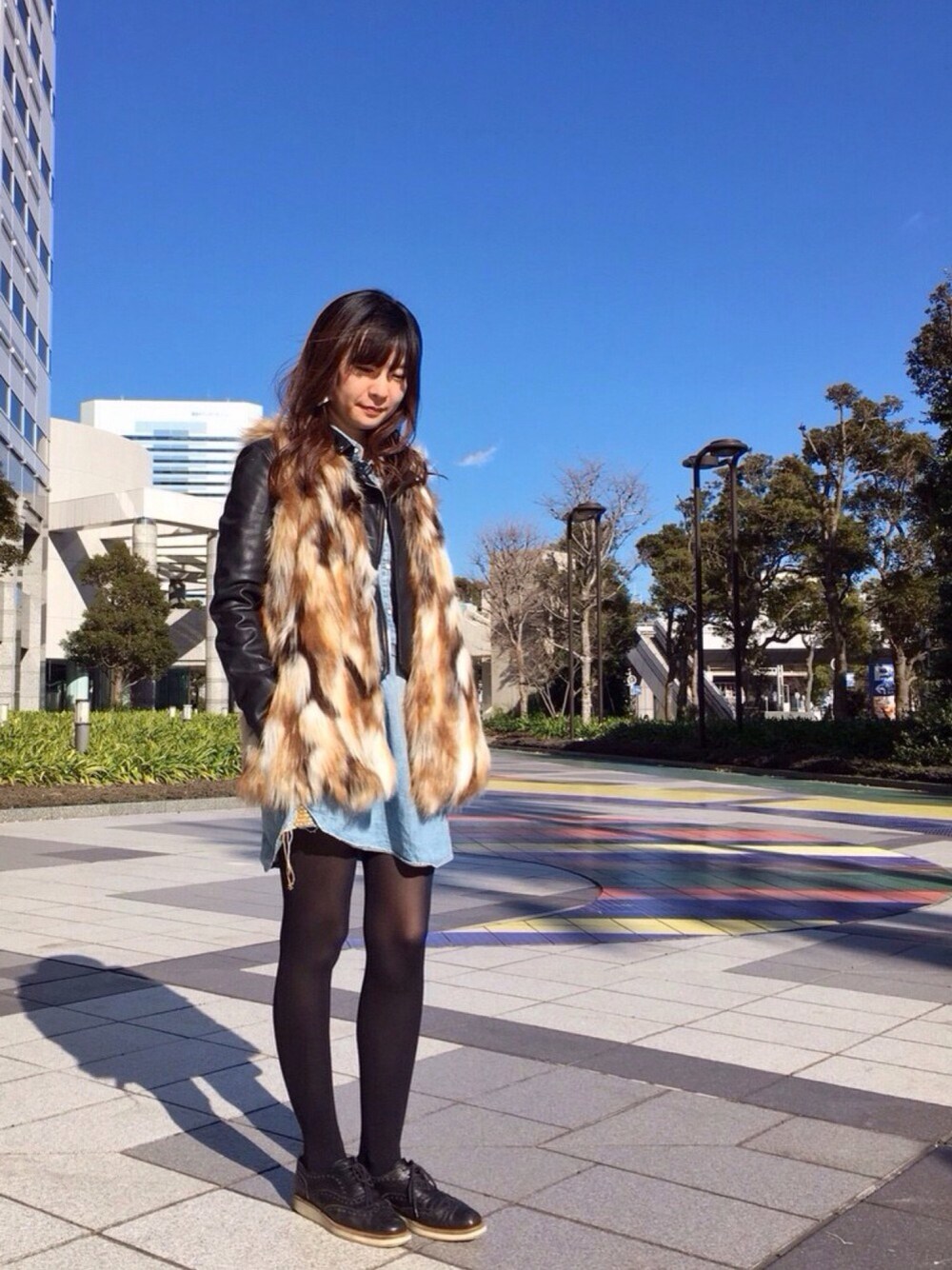 ライダースにファーベストで防寒 眩しい日