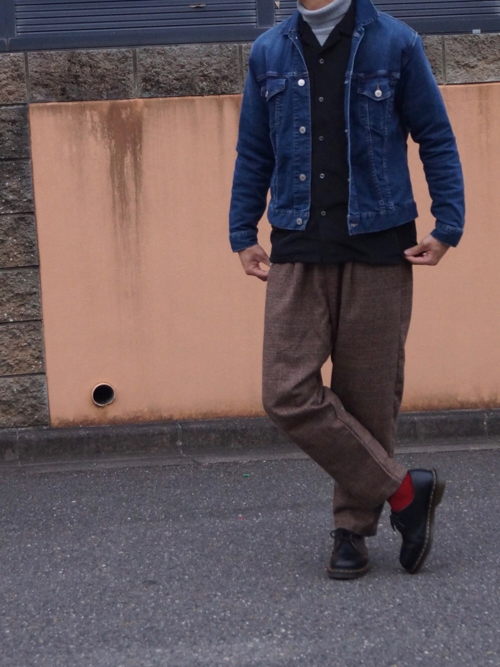 デニムジャケットコーデ🙆♀️ イージーパンツ可愛くて好きです👻 ワンポイントで赤靴下👏