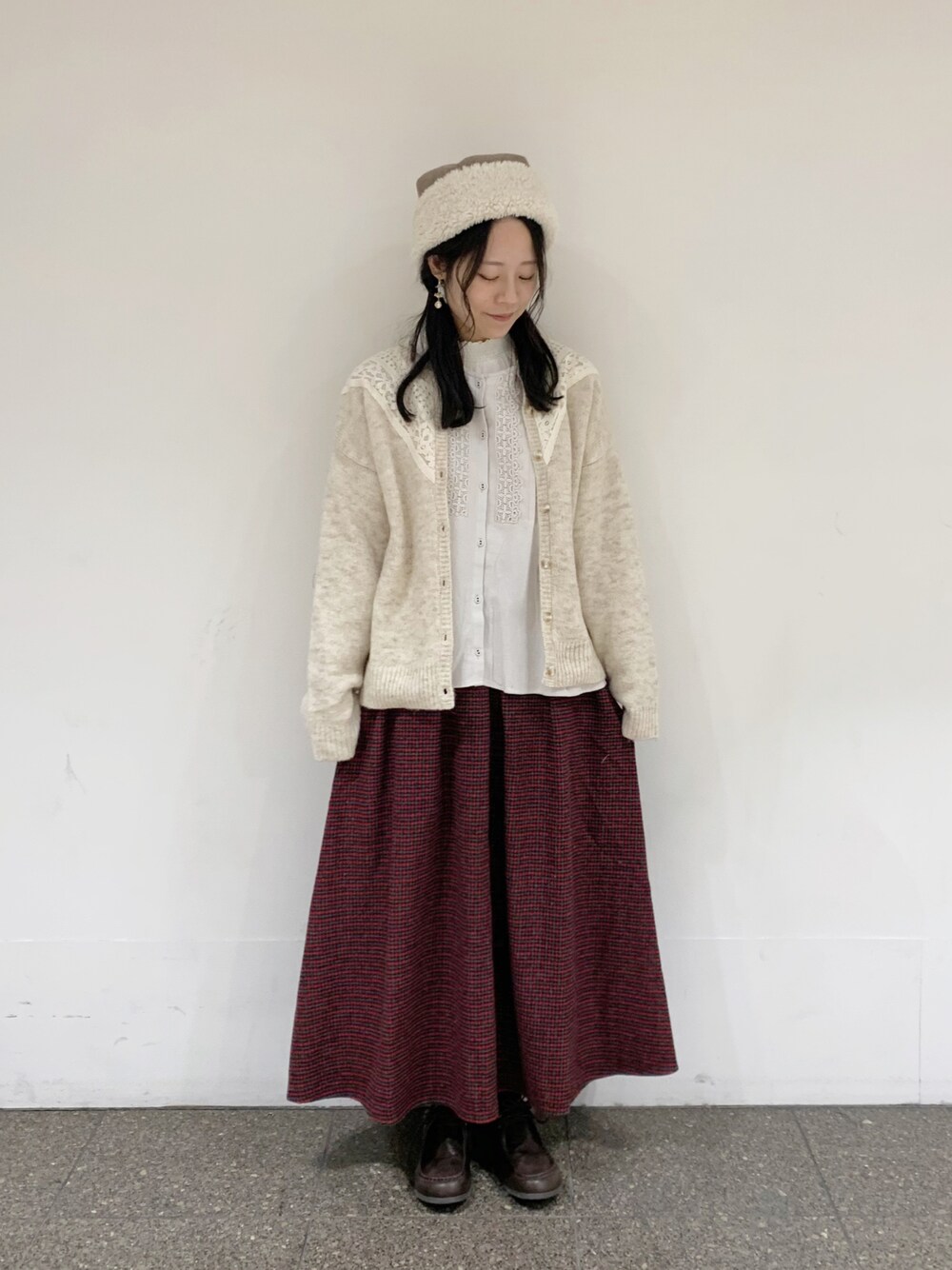 ご覧頂きありがとうございます * 王道ガーリーコーデ 🧶 キナリ×レッドの組み合わせは冬らしく ほっこりかわいいです ♡ スカートはあたたかみのある生地で シルエットがとってもきれいです ◎ 160cmには 長めの丈も嬉しい ..♩ ---------- 阪急三番街店 スタッフWEAR ʾʾ ma【@3orange3】 mari🧸【@osakana1129】 おすず【@ncha117】