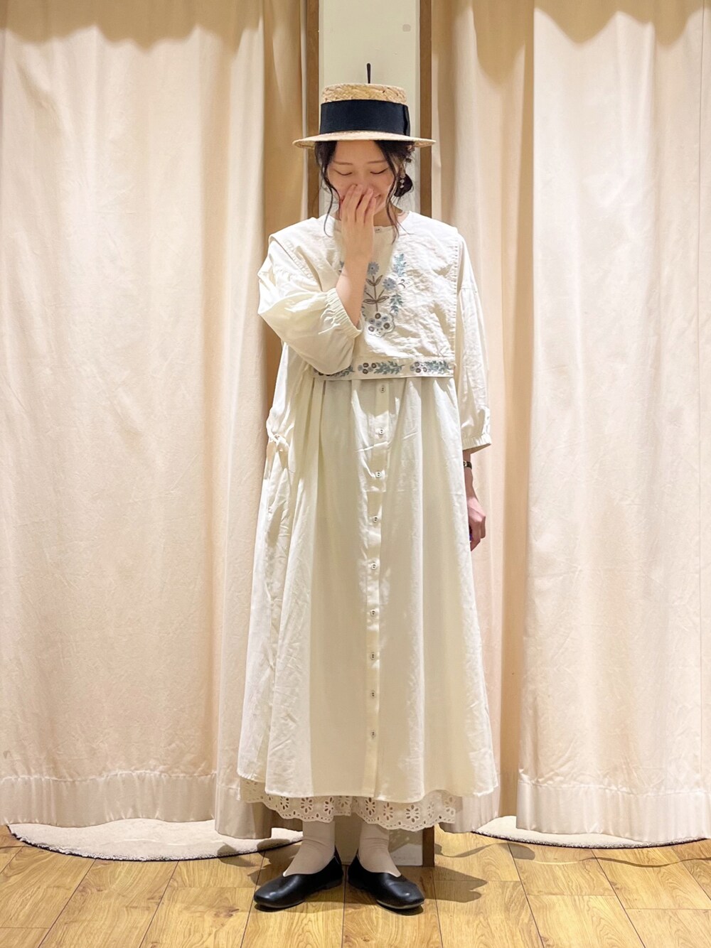 marin.🐏のベスト「脇リボンフラワー刺繍ベスト」を使ったコーディネート