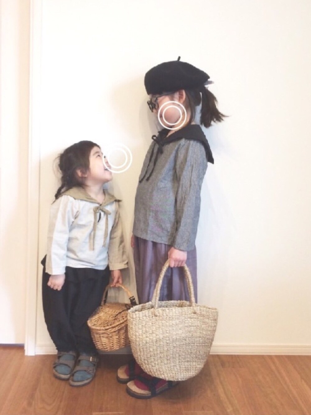 上下色違いでお揃いコーデです。 妹はベレー帽拒否で投げ捨てられました。