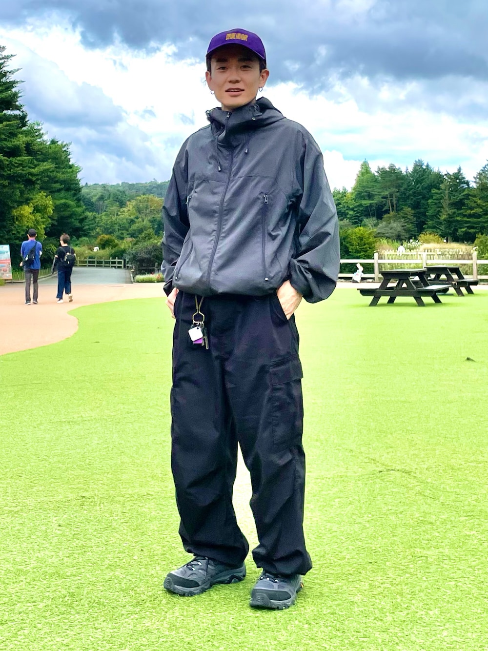 テック系のアイテムでゴープコアな秋コーデ🍂 ブラックのSalomonばかり見かけるから、チャコールのMERRELLにしてみた。 アウターはシューズに合わせてチャコールのシェルパーカー。アウターはもう少し派手な色でもカッコいいはず。ちょっとアウター大きすぎたので折り込んで、ウエストの紐で縛ってます。 全体的に暗くなってしまったのでキャップで差し色。差し色キャップは赤をよく見かけるので紫にしてみた。