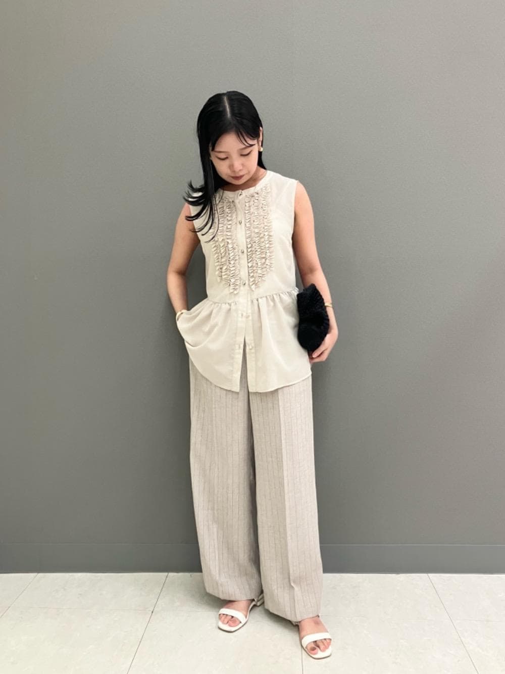 20代前半/155cm/骨格ストレート/普段サイズ36〜38/着用全て38サイズ 【フロントフリルペプラムブラウス】 サイズ感:おしりがすっぽり隠れる丈感。 素材感:とても薄手で涼しく、真夏にもってこいです。ベージュ等のインナーを着ていただくと透け感を抑えられます。 着用感:丈の長さと裾のフリルで生地に落ち感があり、上半身の肉感を拾いません。 腕を出したくない方には シアーVネックカーディガン(品番:3043020701)や«手洗い可能»イージーケア麻ノーカラージャケット(品番:3043075819)と組み合わせるのも◎ 【«セットアップ対応»リネンライクストライプタックワイドパンツ】 サイズ感:丈は長めで全体的にゆとりがあります。 素材感:パリッとした麻のような生地感ですが、実際はポリエステル99%(レーヨン1%)とシワになりにくい素材です。お家でお洗濯も◎ 着用感:ワイドなお作りなので動いても肌に張り付かず、夏場でもとっても快適に◎大人リラクシーなシルエットを演出してくれます。 リネンライクストライプノーカラージャケット(品番:3043075802)とセットアップ合わせもおすすめです◎!
