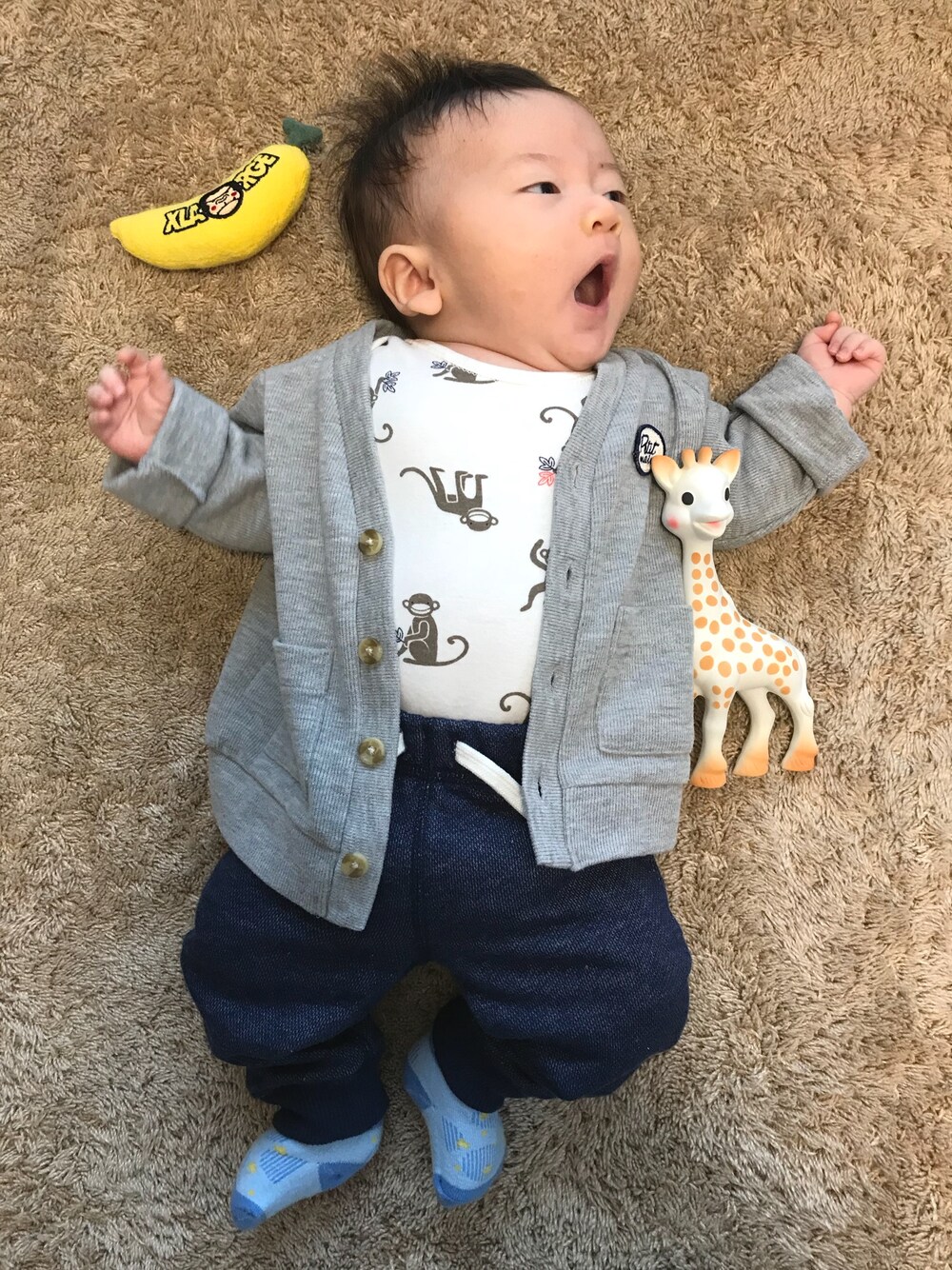 ふぅさんあくび中...😪 今日は雨だから1日おうちday☔️🌀 カーディガン70㎝でブカブカだから春先まで着れるかな〜❤️