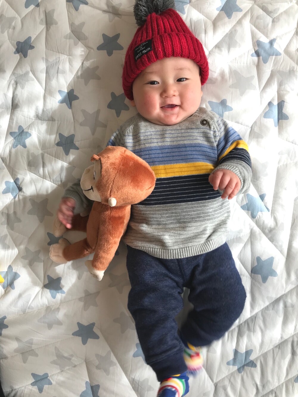 少し前に寝返りがえりが出来るようになってゴロンゴロンしてます😝💕 ますます目が離せなくなって来た💦 H&Mのニット初めて着て同級生の男の子のいるママとランチに🍕
