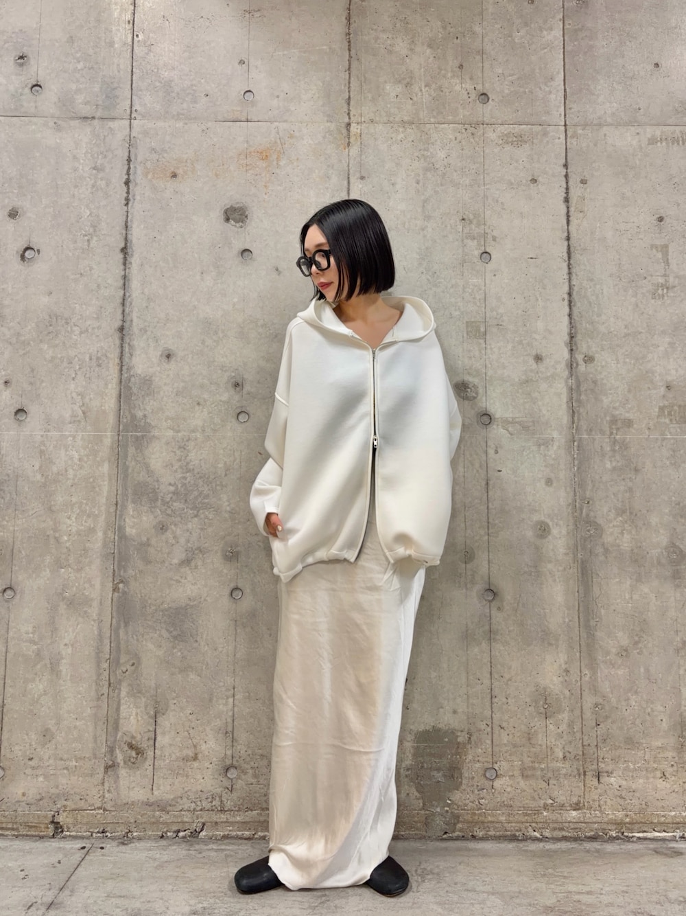 新作のパーカーをワントーンで コーディネートしてみました。 パーカーはドローコードがついているので シルエットを変えて着用できます。