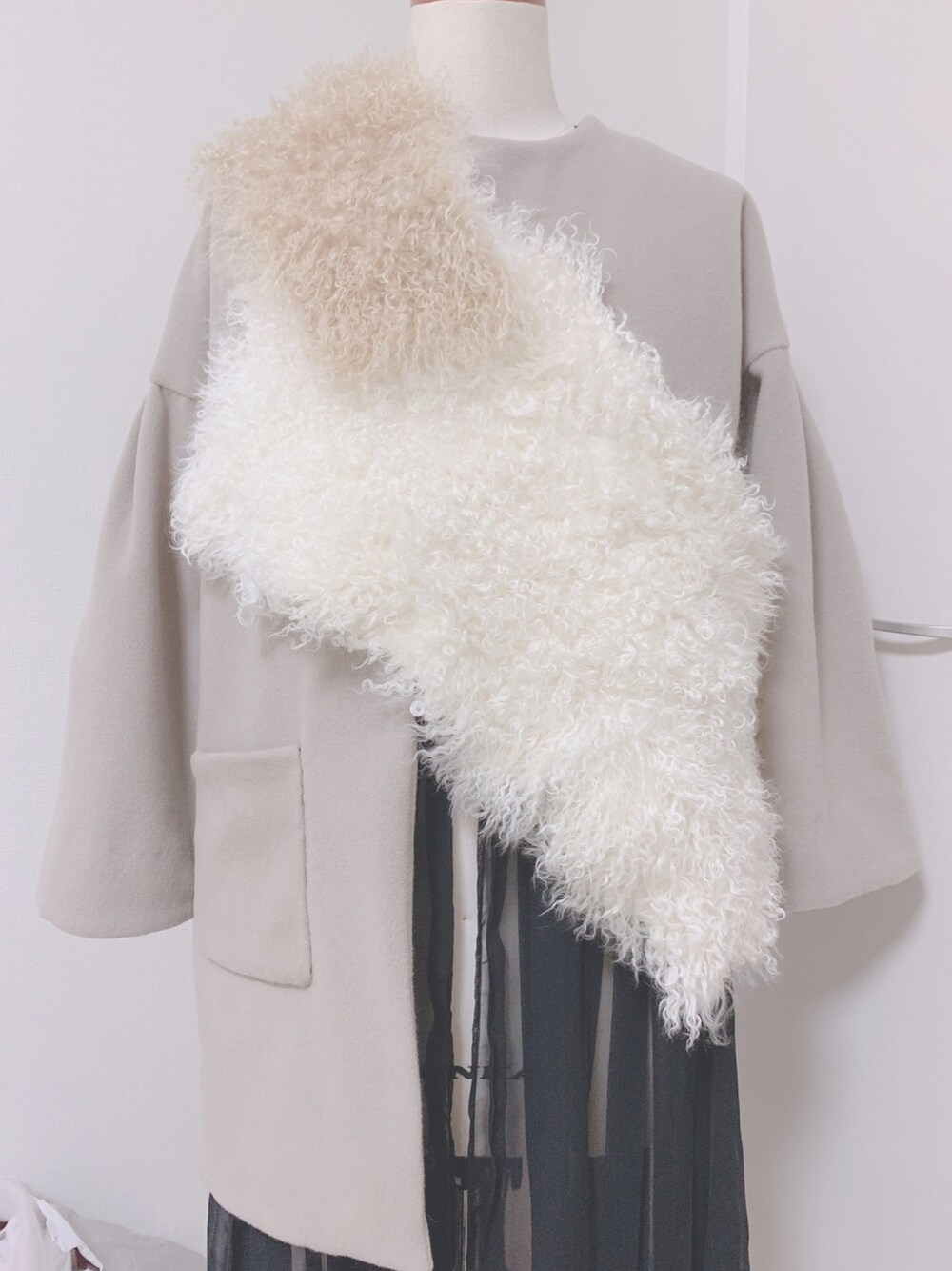 ALL handmadeです! 今年のコートは肉厚なウールで スクエアシルエットでアシンメトリー! パッチポケットもポイントです! チベットラムで作った ファーアイテムも万能でかわいい!