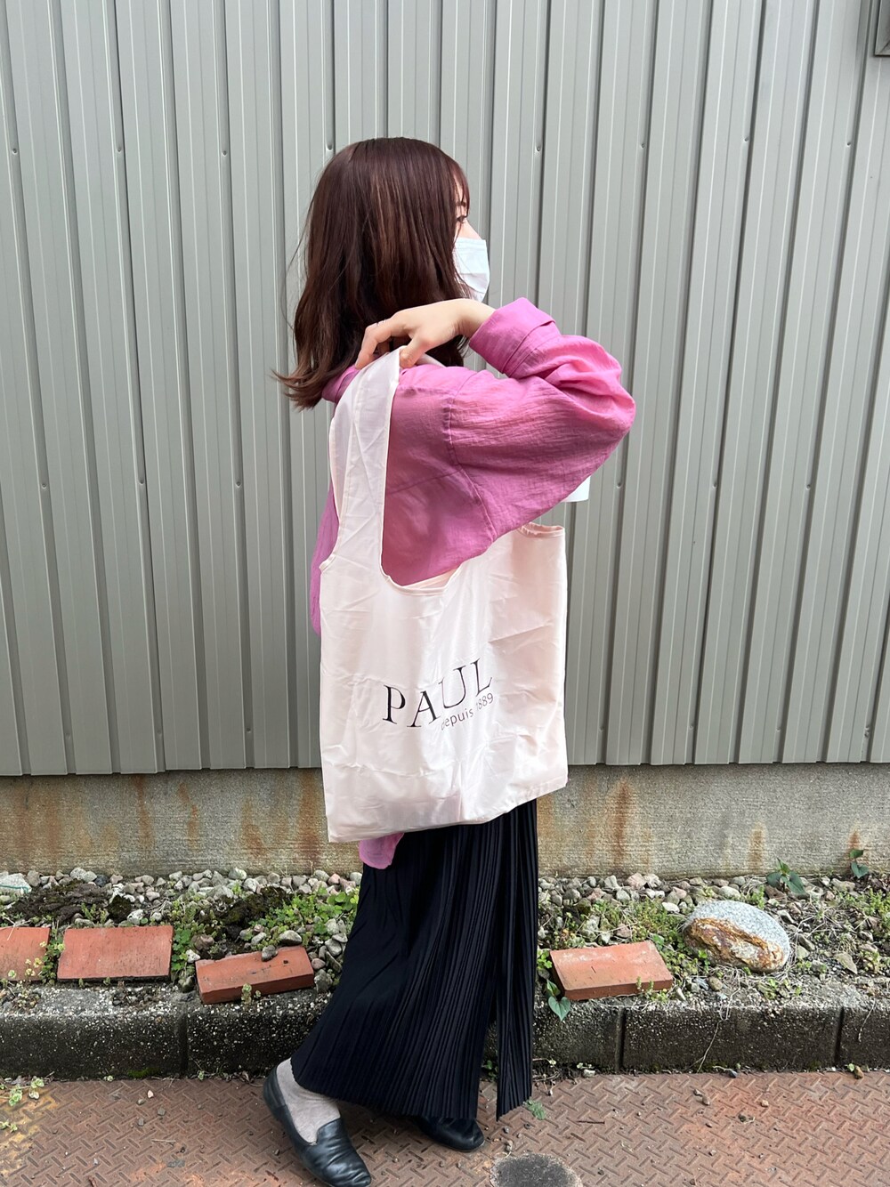 春のお買い物コーデ🌸 ピンクのシャツとPAUL🥐のエコバックがマッチしてお洒落𓂃