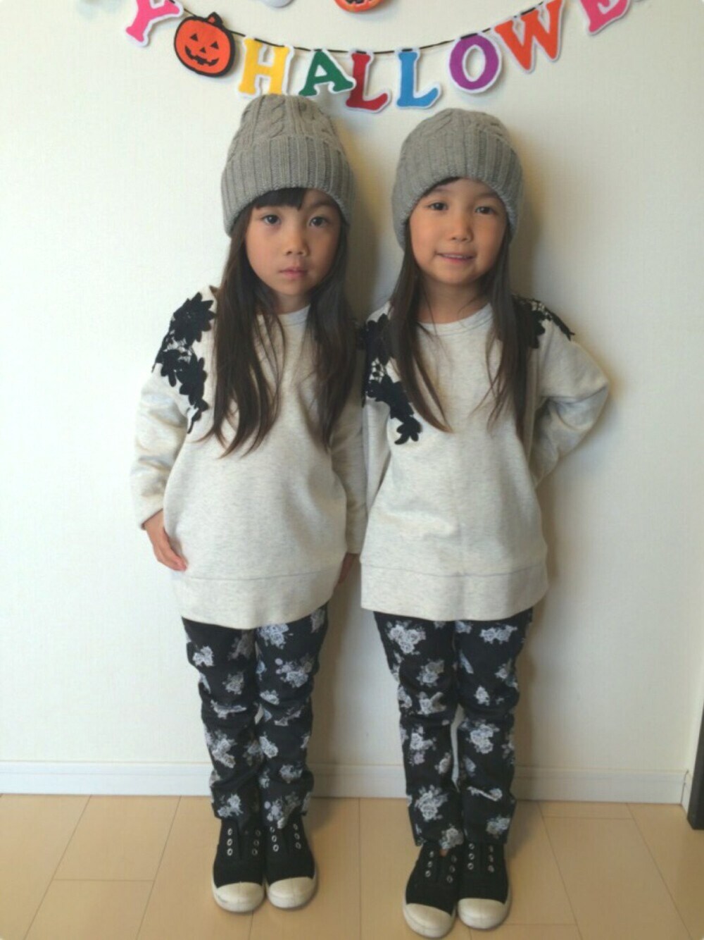 花柄コーデ。 モノトーンでシンプルに。 今日は半日幼稚園。 うっかり寝坊して、髪の毛ボサボサで幼稚園行きました。 午後からはニット帽でごまかしたよ。