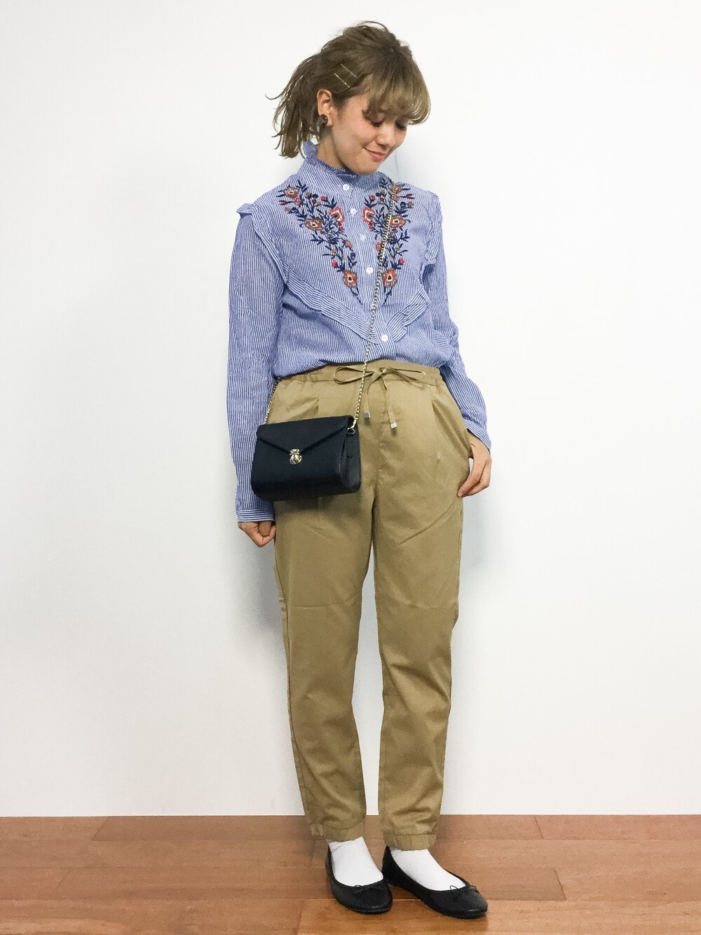 piya*のシャツ/ブラウス「【再入荷】【GISELe4月号掲載】フラワー刺繍入りスタンドフリルカラーフロント&バッグフリルストライプブラウス」を使ったコーディネート