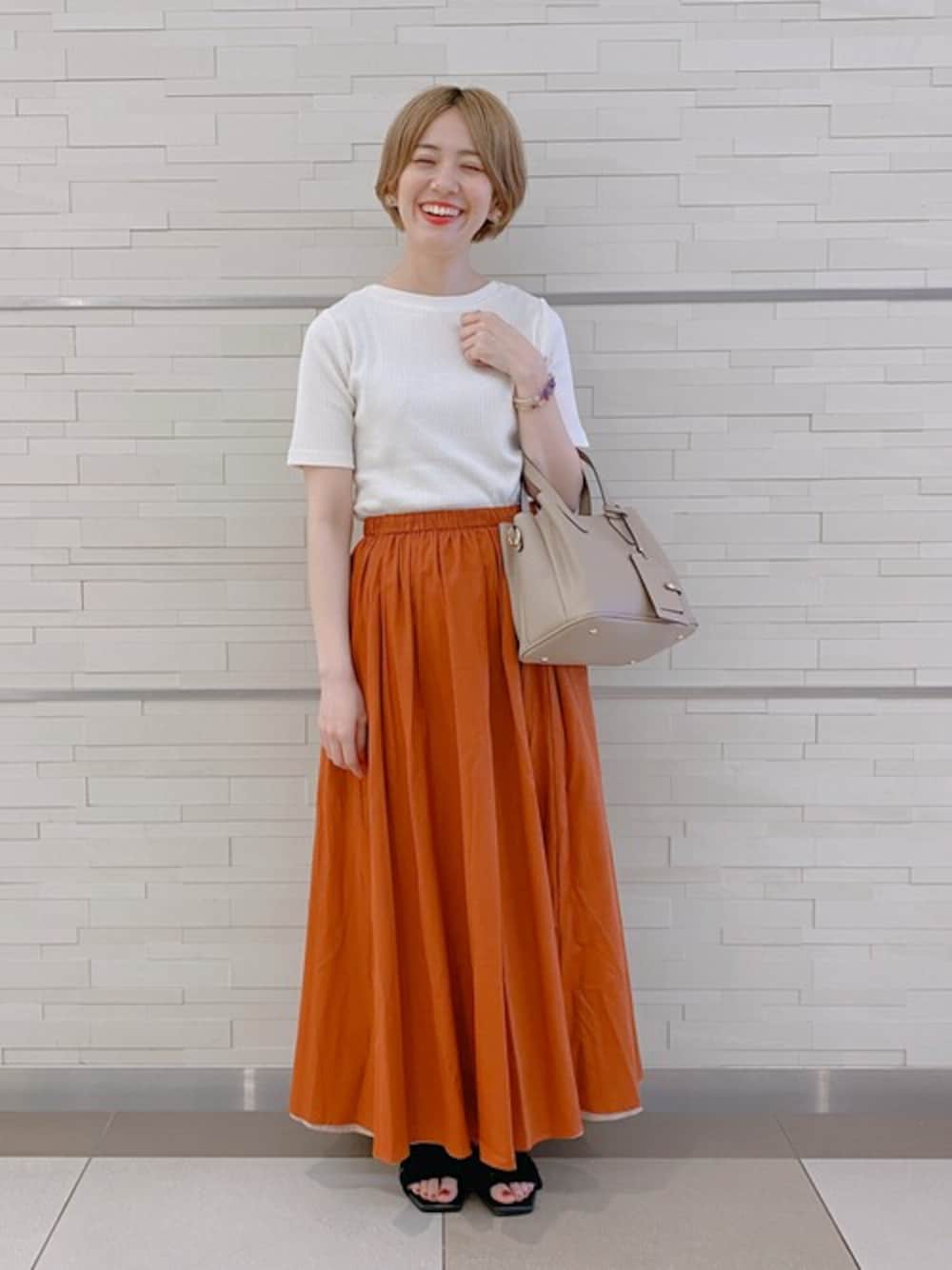 こちらのスカートはリバーシブルになっているので、オレンジとベージュどちらのお色味でもお使いいただけます! その日の気分やトップスの色味に応じて使い分けられるのは嬉しいですね◎ 針抜きのTシャツは襟元のデザインが変わっていてオシャレな印象に。 いつもより大人なコーディネートにしてみました!