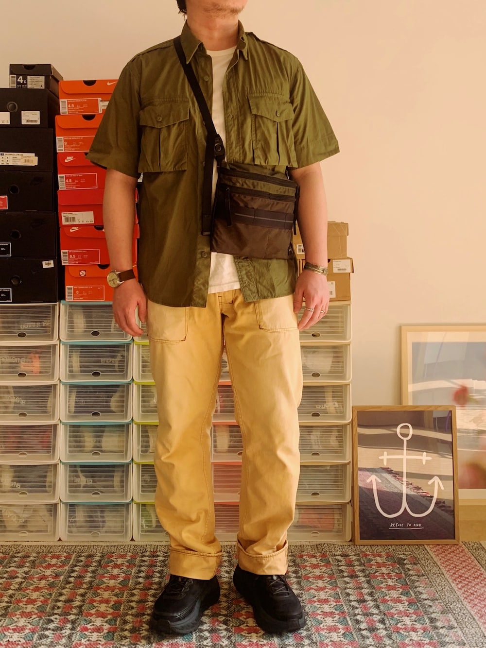🍃春日混搭🍃 包袋: MASTER-PIECE 内搭: NIGEL CABOURN 衬衫: SNOW PEAK 裤子: POLO JEANS COMPANY 鞋子: HOKA ONEONE