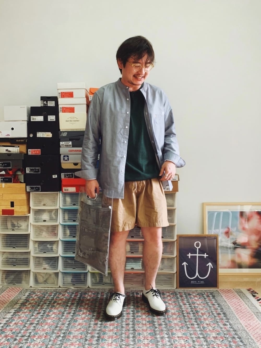 9.11🌻 包袋: MISTERGENTLEMAN 衬衫: PRAGMATY 内搭: PRAGMATY 短裤: PRAGMATY 皮靴: Dr.Martens x BEAMS