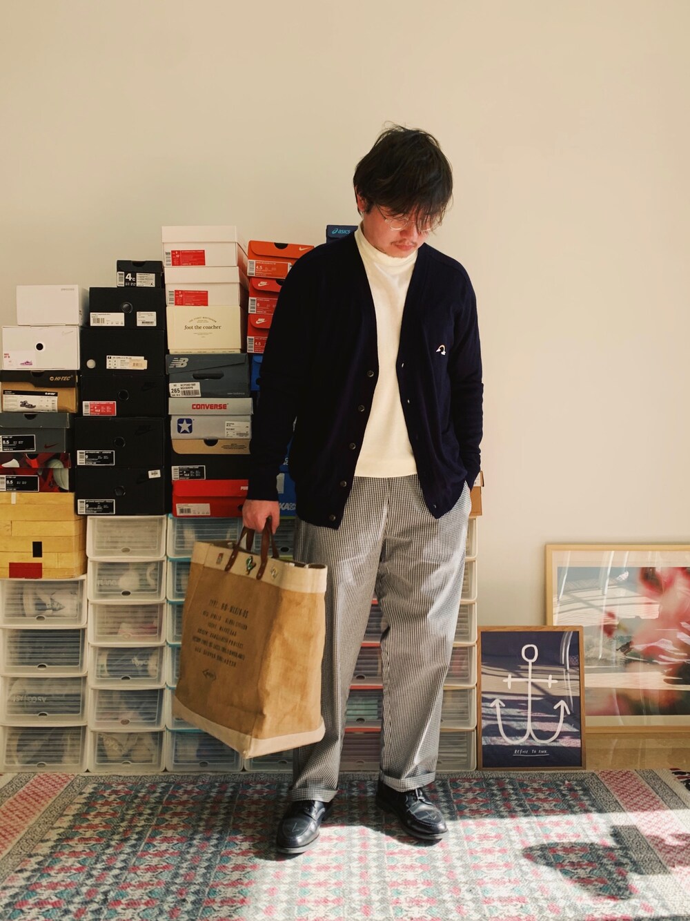 9.23 秋日穿搭🍂 帽子: APOLIS 高领: CHUMS 开衫: PRAGMATY 裤子: PRAGMATY 皮靴: SANDERS