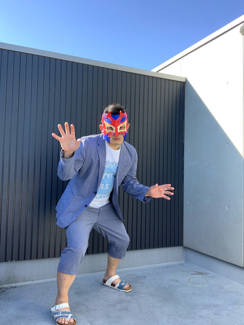 何時ぞや初夏のビール祭りに参加した時のスタイルです。 ドレスコードを維持しつつ、路上祭りなのでTシャツとサンダルで着崩し。 夏っぽく青を主にカラーをまとめてます。 Tシャツが鈴木みのるのファッションブランド『PILEDRIVER』のもの。 鈴木みのるにして水色は珍しい色彩ですが、夏ならそれもまた良いでしょう。