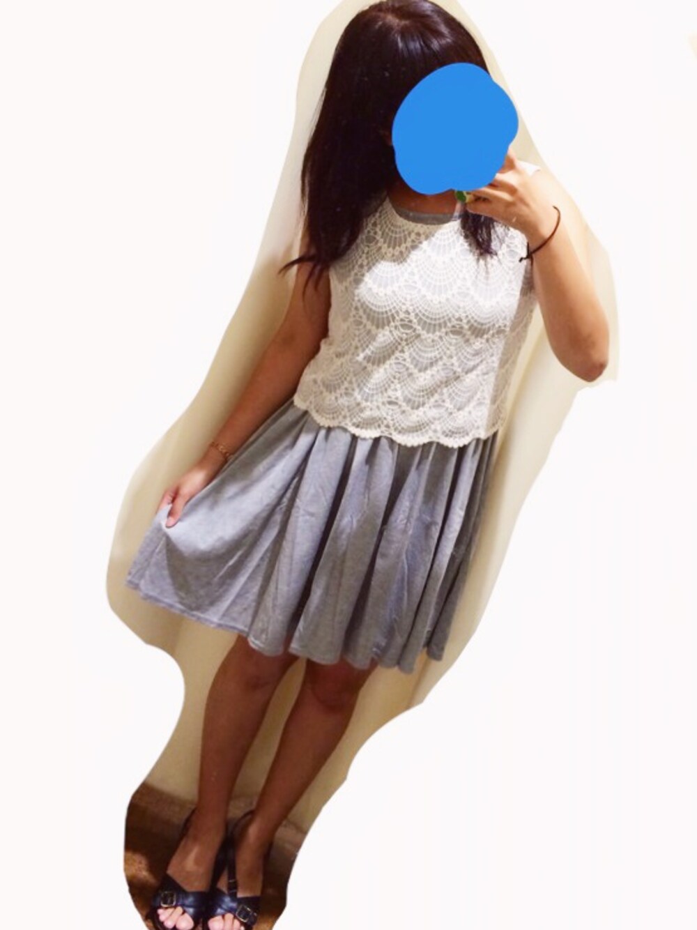 earthのSALEで試着したときに 。 形と女の子らしさに惹かれて購入しましたよ。 色は グレーとネイビーとブルーがあって 大人っぽく感じた、ネイビーに。 SALEは最高ですね 。 来年は もっとたくさん夏服ほしー。 (・ω・)