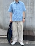 高円寺で古着屋さん巡りした日の服です。 暑い日でも沢山歩くのでスニーカーを履いて、爽やかに軽い色味でまとめました! お気に入りのAURALEEの青シャツはさらっと羽織れていい感じです。
