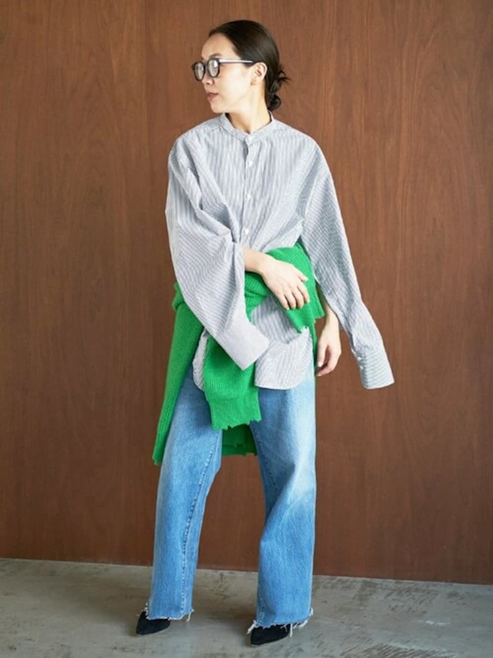 【Band Collar Slit Sleeves シャツ】 身長:152㎝/体型:細身/普段サイズ:S~M/着用サイズ:FREE/イエベ春 サイズ感:ゆとりのあるサイズ感です。 素材感:細かいシワ感をつけたワッシャー仕上げの生地を使用してます。 着心地:袖スリットが入りなので、軽さのある着こなしが楽しめるアイテムです。
