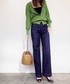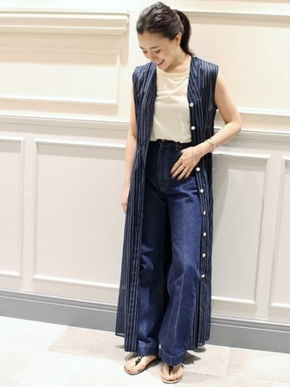 ピンストライプが大人クール センタープレスデニムでカチッとした印象に。 縦のラインを強調してくれるロングレングスも魅力。