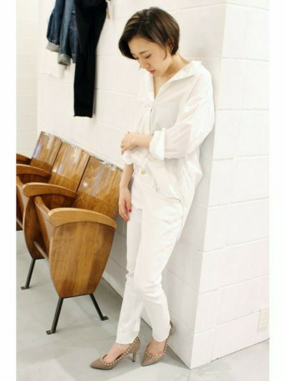 ホワイトコーデ。シャツもパンツもホワイトで統一した洗練されたスタイリング。