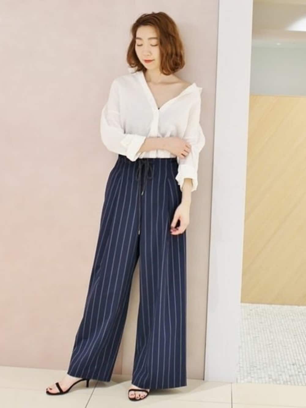 ハンサムパンツスタイル ストライプのハンサムパンツは潔くメンズライクに。 シャツの襟を抜いて女性らしさを忘れずに。