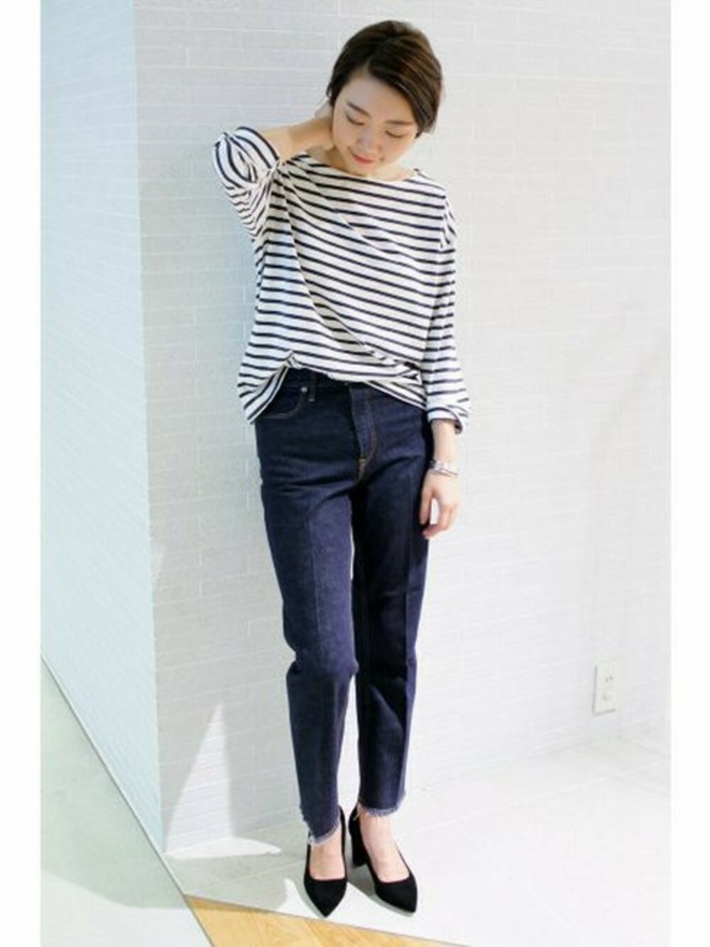 ボーダートップス デニム+ボーダーの定番カジュアル。PELLICOのパンプスで特別感を。