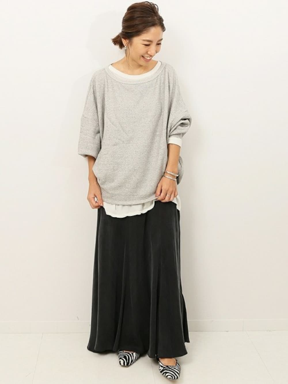 程よい落ち感が上品見えするギャザーロングスカート。 裾にかけて広がるフレアシルエットにウエストゴムでリラックスした履き心地。 シンプルなのでニットにも、スウェットにもテイスト選ばず着回しがきくアイテムです。