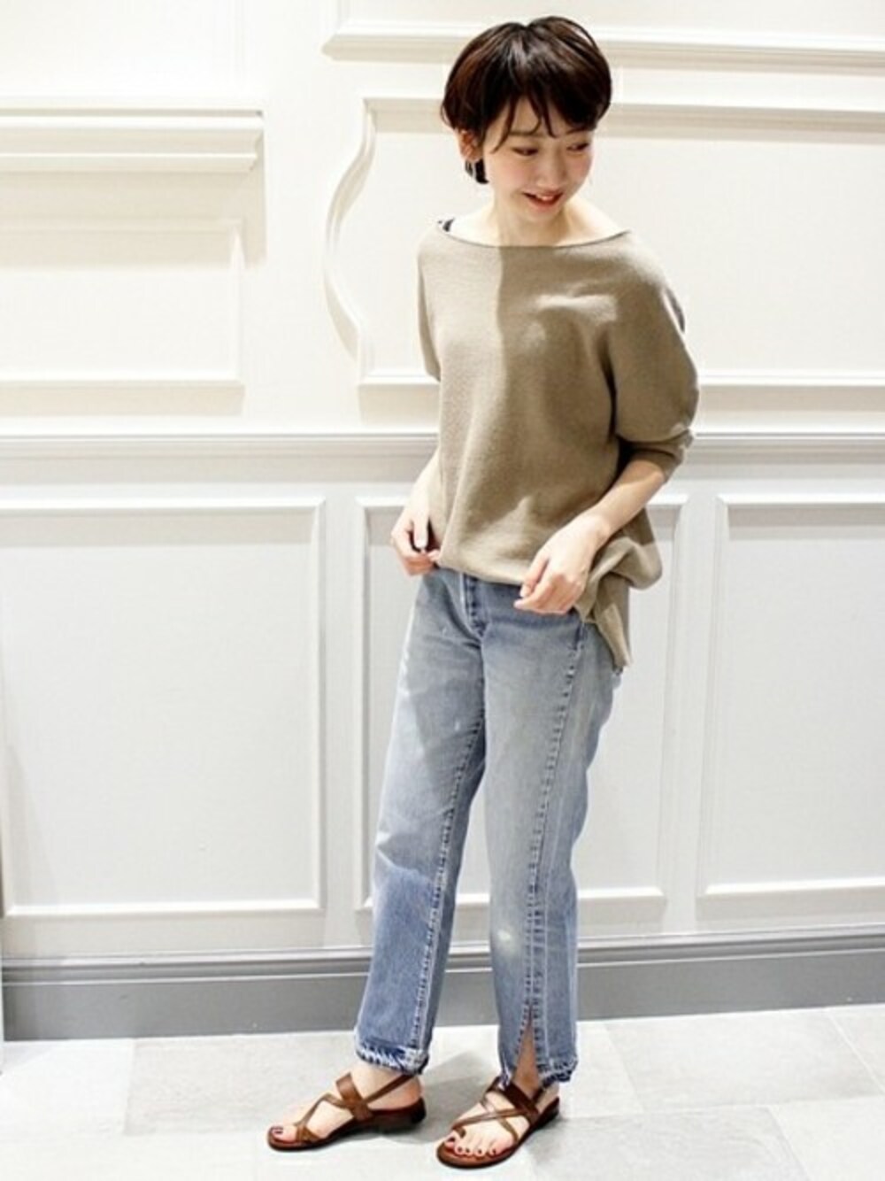 デコルテ美人 女性らしいネックラインをメイクするカットソー。デニム+フラットサンダルのカジュアルコーデも、どこか艶っぽく仕上がります。
