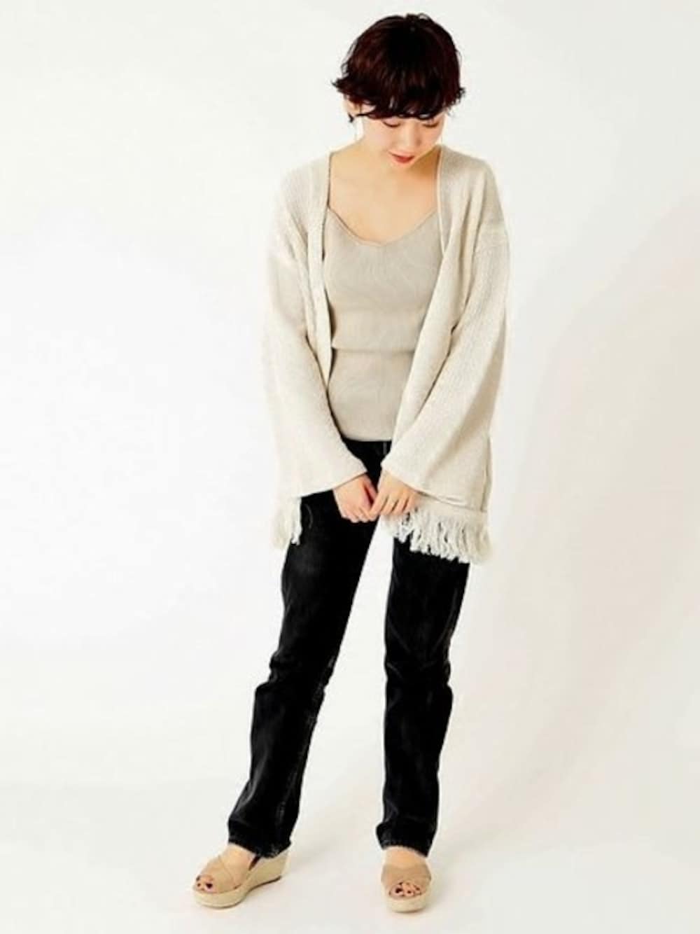 雰囲気たっぷりのルックス リラックス感を演出するフリンジカーディガンは、ヌーディーな色味がポイント。インナーで肌魅せして大人の余裕あるスタイリング。
