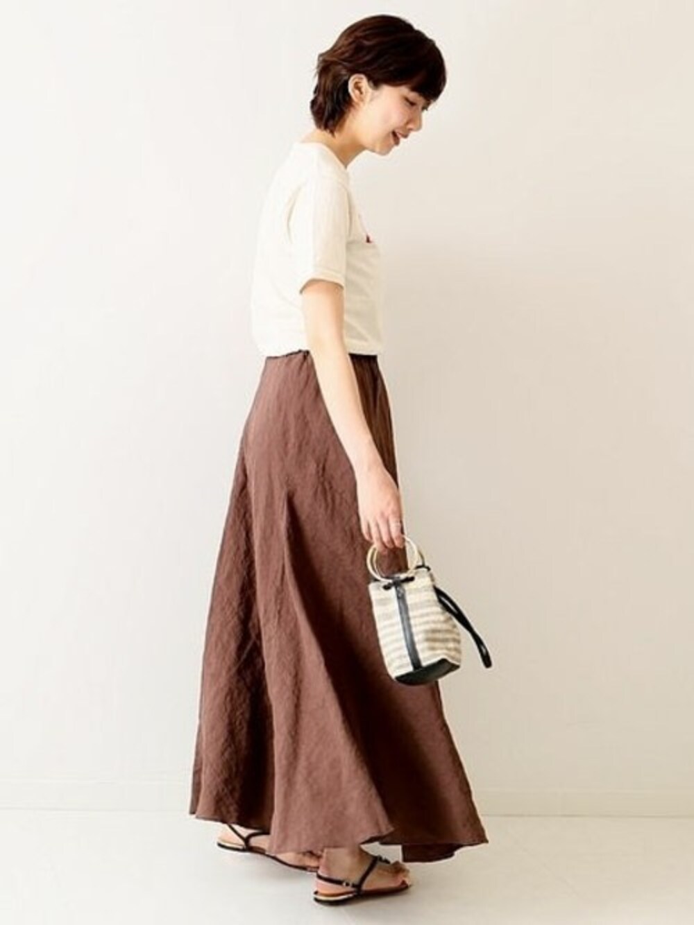 リネンスカート+Tシャツのカジュアルスタイル。 夏にピッタリの涼感フレアスカート。
