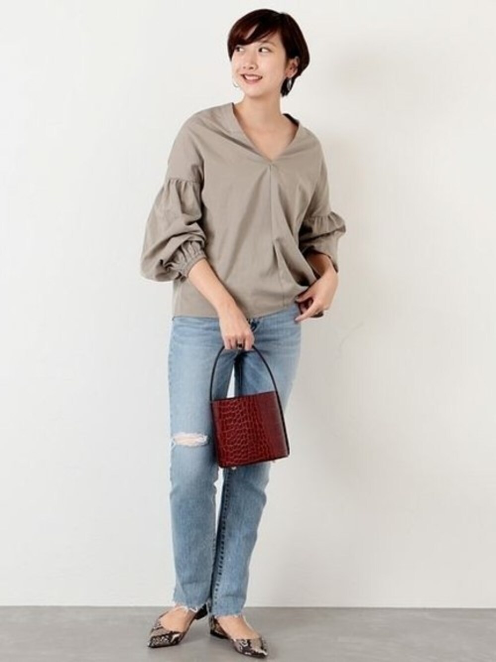 ブラウス×デニム さらっと着こなしたいデニムコーデ。 上質なバッグとシューズで格上げ。