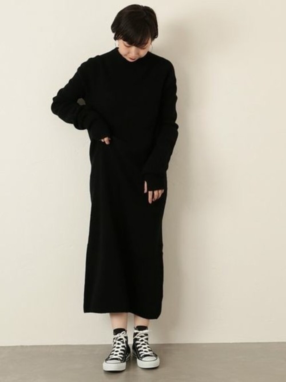 リラックスムード溢れるニットワンピ。 足元はスニーカーでラフにあわせて。